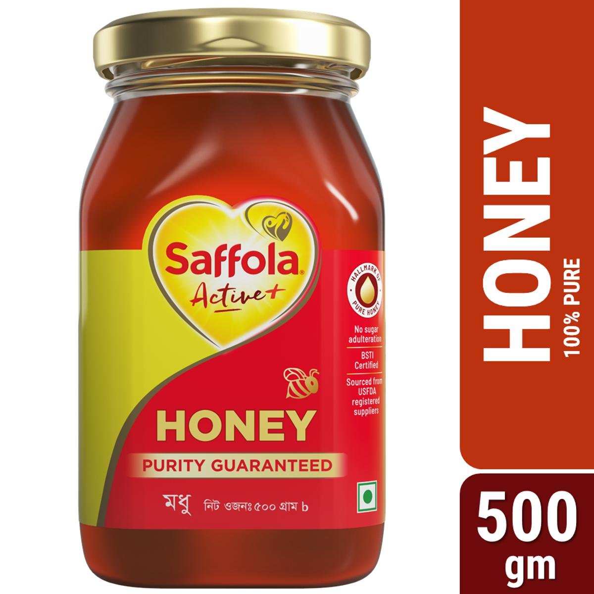 - Saffola Active+ Honey, which comes from 50+ years experienced international brand Saffola, is a natural honey that gives the guarantee of purity. Saffola Honey is tested in 100+ laboratories, free from adulteration and no excess sugar is added here.
